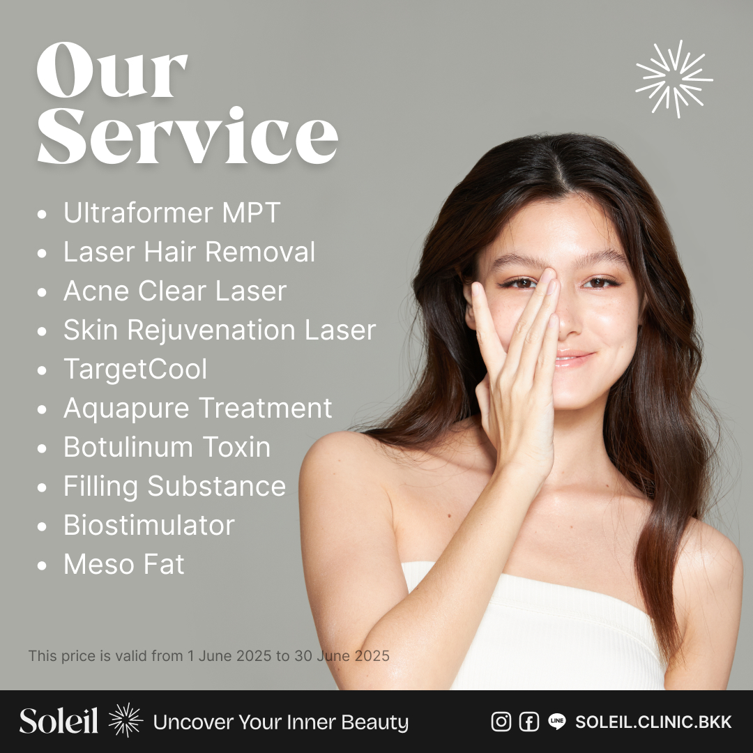 พบกับบริการที่หลากหลายจากโซเลย์คลินิก ที่ช่วยให้คุณดูดีและมั่นใจมากยิ่งขึ้น พร้อมตอบโจทย์ความต้องการต่างๆที่คุณกังวลไม่ว่าจะเป็น Ultraformer MPT, Cool YAG Laser, Botox, Filler, TargetCool, K-Booster, Biostimulator และทรีตเมนต์อื่น ๆ ที่ออกแบบมาเพื่อดูแลคุณแบบเฉพาะตัว